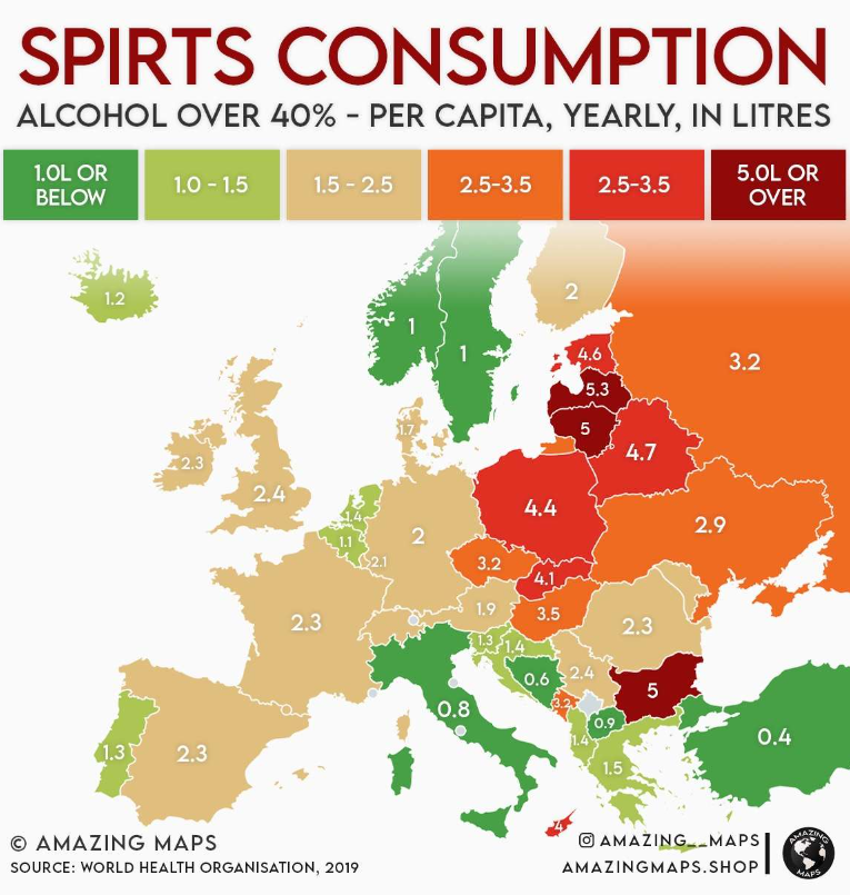 Consommation de spiritueux, plus de 40% d'alcool, en litre à l'année par habitant (2019)