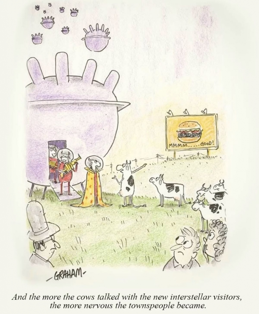 Le dessin de Graham est plus drôle dans le sens où il nous laisse imaginer la suite. Les personnages visibles semblent semblent, eux aussi, la deviner.