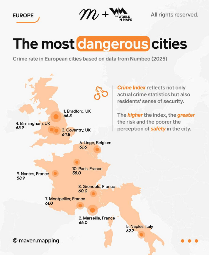 Taux de criminalité dans les villes européennes d'après les données de Numbeo (2025).